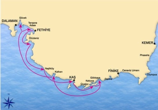 | Day 1 Embarkation to the gulet at the afternoon in Gocek. The Gocek coves and islands are the meeting point of Turkish high society. Gocek which was a calm and quite village until almost yesterday, is now the scene of the rapid construction work. We will cruise to Yassicalar Island; this groups of islands are so small that no one could came up with names for each of them. They are together known as Yassicalar. There are no facilities on the islands. On the largest island of the group the beach is near the point and forms as a small pool, excellent for children. One is able to swim between the different islets, the closest being just 12 meters distance. If you can swim for half an hour, you can visit four different islands and if you have shoes with you you can walk over on each of them. Overnight in Yassicalar Island. Day 2 Afterwards we cruise to Oludeniz .The Blue lagoon of Oludeniz has calm , crystal-clear waters which make it ideal for watersports, and very safe place for people to swim. Part of the lagoon area is now protected as one of the national park of Turkey. Paragliding options are also available. Day 3 Around sunrise we have an early departure to Firnaz Bay near Kalkan where we expect to stop and serve breakfast and if you choose to, go swimming. Cruising to Kas, was founded in the 4th century BC as Antiphellos.Now the only Lycian rock tombs & sarcophagi and the Roman theatre are left. But the charm of the town remains! The swimming and diving are excellent in Kas. For your interest we can arrange you a scuba diving with diving inscrtuctor, the ideal is one or 2 dives each for 35 minutes. In a bay near Kekova we stop for swimming, dinner & the 2nd night. Day 4 After having breakfast, departure to Sunken City of Kekova (this Lycian- Roman archaeological site is protected, so only looking!) Diving is no longer permitted since the area became a protected national park. we will cruise to Simena Kalekoy offers a panoramic view of the bays, inlets, islands and colorfull yachts sailing peacefully over the glassy water.You can hire a sea kayak to explore the area. we will cruise to Kalkan, a lovely small hilltop town that overlooks a tiny bay. Its quaint, traditional, whitewashed houses, shuttered windows and balconies with brilliant flowers that casdade to the streets below make it the ultimate in a peacefull holiday town. We have swim break in Firnaz Bay overnight. Day 5 Arrival to Butterfly Valley, Pieri, Rapos, Euglapia, are just some of over 40 different species of butterfly that grace this beautiful bay.Starting with spring , they can be observed for up to 9 or 10 months of the year.We ll have breakfast here than we cruise back to north. We arrive Fethiye at the afternoon , you can see Fethiye town org o shopping , another option is you may join the the activity of Turkish bath. Overnight in Fethiye Day 6 After we had our beakfat in Fethiye harbour we will cruise to Zeytin Ada;(Olive Islands) is at the south end of the Yassicalar group islands. It is only island that is privately owned. There is also olive pressing workshop dating from the Otoman area on the island.We will pass to the Tersane island, have a large time there for swim and relax. Day 7 Today is our last day, we will have some great bays to complete our weekly cruise. First stop is Domuz Island, it is believed that it has taken its name from the wild boars livind on that island once upon a time. The island is also called Princess Island referring to a prince living on here. Gulets can easily anchor and moore in the cove of islands as its sheltered from the winds. Next stop is Cleopatra Bay, Also known as Hamam (bath) Cove, this island is one of the coves that gulets and yachts on the Blue cruise can not pass without visiting. The cruisers love to spend the night there. Right next to there you will see the ruins of a monastery which is partly under water. You may enjoy having a pleasant walk on the shore and in the forest if you get off the gulet. Cruiser love to spend the night in Cleopatra Bay, as we will do same. Overnight in Cleopatra Bay. Day 8 After breakfast at 10:00 gulet criuse ends in Gocek Harbour. | |