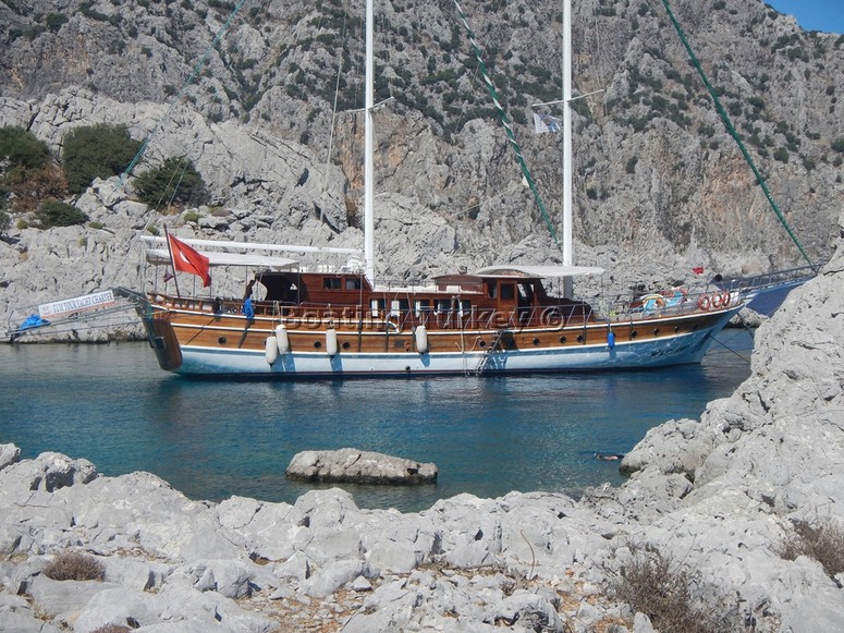 We had a smooth transfer from Dalaman to Marmaris . On arrival at the harbour , our rep from Boating Turkey greeted us and after a brisk 5 minute walk we arrived at our waiting boat. The large map came out and we discussed our route . The whole point of the boat trip was to relax , sunbathe & enjoy the tranquil coast as opposed to hopping on and off and sightseeing etc .